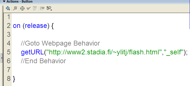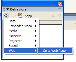 3. avaa bhaviours paneeli (varmista, että paneelissa näkyy nappulan nimi (tässä tapauksessa "nappi"), jolloin varmistutaan siitä, että nappula on valittu) ja valitse + eli "lisää käsky" (add statement) - valikosta web -> go to Web page