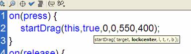 kokeile vaihtaa startDrag parametrit seuraavalla tavalla : startDrag(this,true,this._width/2, this._height/2,550 - this._width/2,400 - this._height/2);
